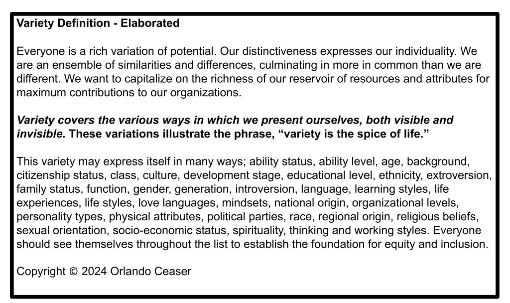 Everyone has distinct qualities that make us unique. Variety as a replacement word may allow people to come to the table and use their various and sundry skills to bring out the best in everyone for the good of everyone in the enterprise. My premise is that substituting ‘Variety” for “Diversity” will help us achieve benefits for all employees.