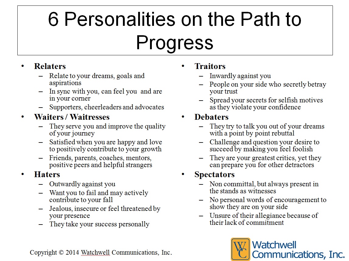 You will encounter a variety of people along the path to progress. There are a number of personalities on your journey willing to provide assistance or to be an impediment to you. Six profiles are highlighted based on personal and group observations. They are the relaters, waiters, haters, traitors, debaters and spectators. No one is exclusively one profile all the time. You may vacillate among the characteristics depending on the situation and the people involved. It is important to identify these personalities in order to enlist their assistance or to avoid their negative attacks on your well-being and your ability to achieve outstanding results.